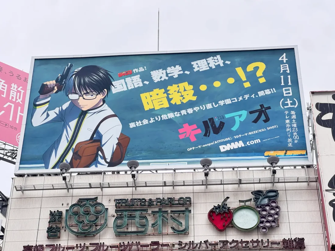 週刊少年ジャンプの人気漫画「キルアオ」(原作:藤巻忠俊(代表作:「黒子のバスケ」、「ROBOT×LASERBEAM」)が2026年4月11日(土)夜11時からテレ東系列にてTVアニメを放送開始することに合わせ、渋谷駅クランブル交差点周辺を中心とする広告ジャックが20206年3月30日(月)より順次開始されました。
