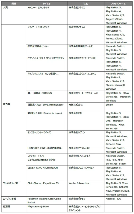 今回で開催29回⽬を迎える「⽇本ゲーム⼤賞 2025」の年間作品部⾨の⼤賞を「メタファー︓リファンタジオ」(株式会社アトラス)が受賞しました。ブレイクスルー賞は、「Clair Obscur: Expedition 33」(Kepler Interactive)、ムーブメント賞は、「Pokémon Trading Card Game Pocket」(株式会社ポケモン)がそれぞれ受賞。このほか、対象期間中に話題になった作品、計11作品(対象作品含む)が優秀賞を受賞しました。